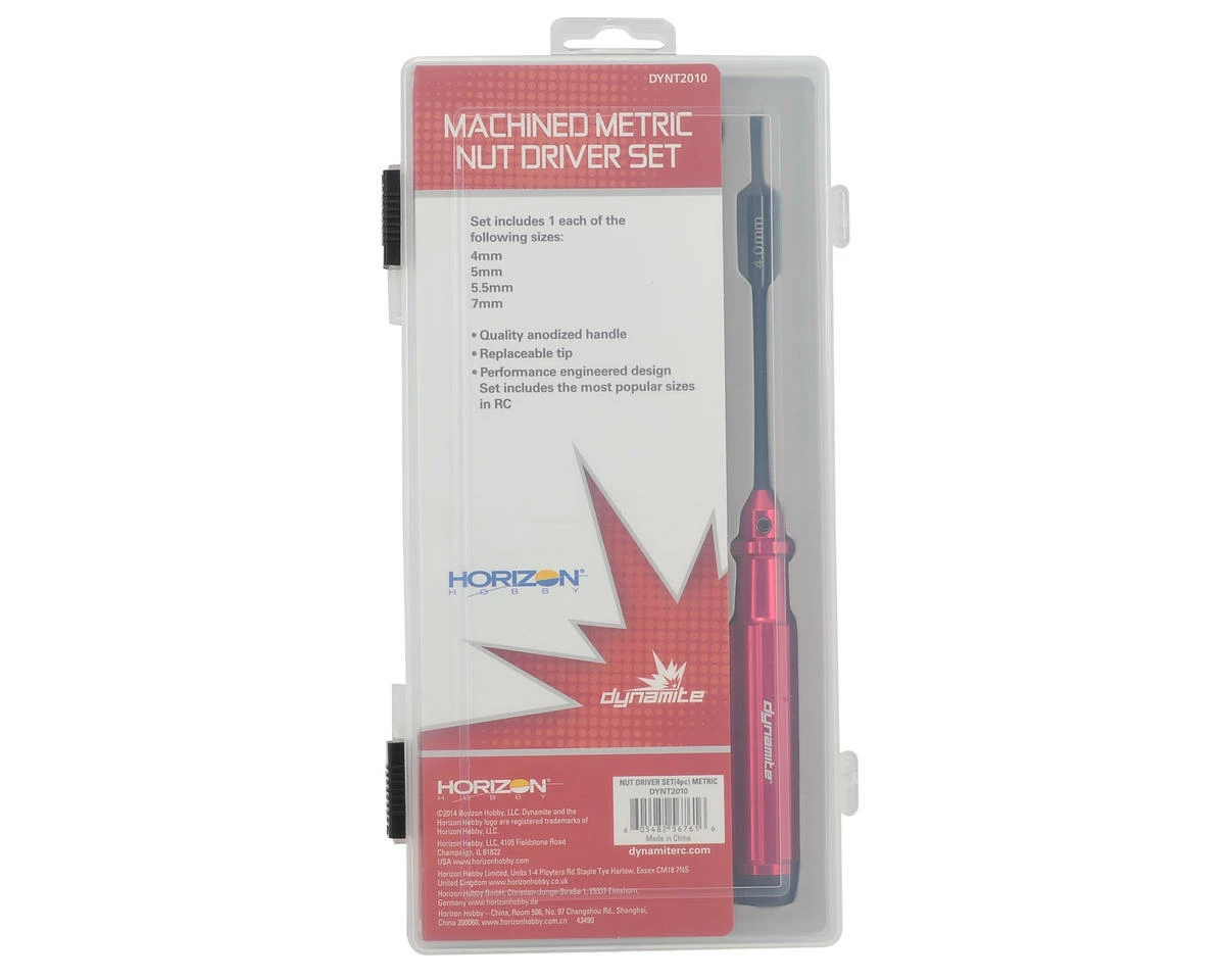 This is the Dynamite Machined Metric Nut Driver Set. Dynamite tools feature stylish red anodized aluminum handles, with replaceable steel tips. To make wrenching easier on your hands, the handles include rotating plastic end caps to swivel in your palm. Plus, the end caps have the tool size printed on the end, and are color coded for easy identification. Package includes 4mm, 5mm, 5.5mm and 7.0mm size nut drivers.