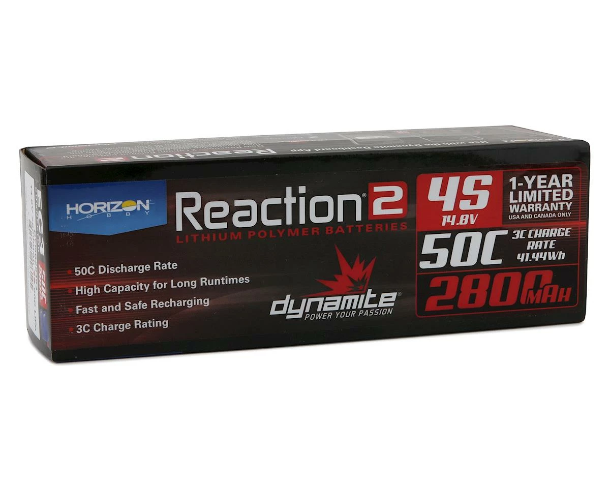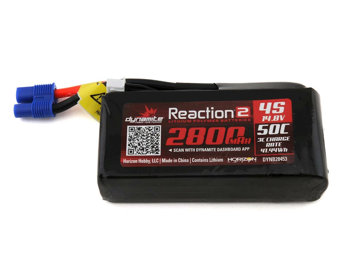 Dynamite Reaction 2.0 4S 50C LiPo Battery. This is a 4S, 2800mAh, soft case LiPo battery with an EC5 connector.