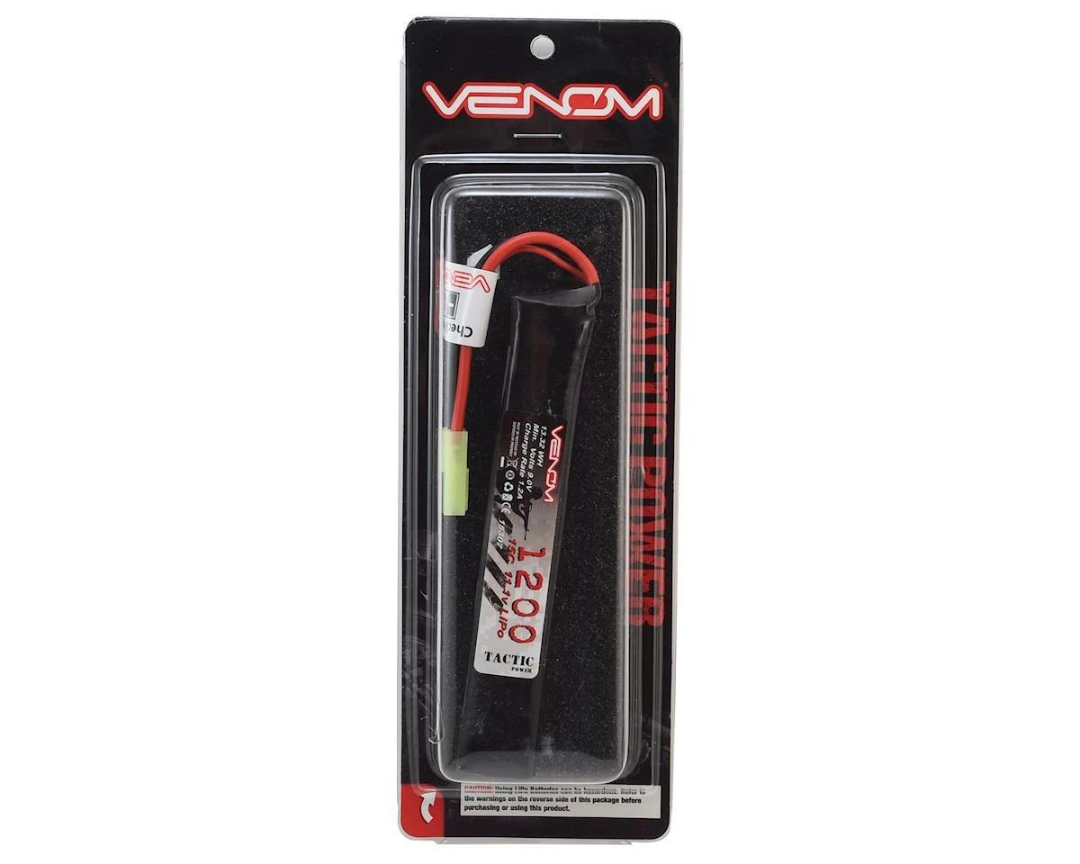 This is the Venom 3S 11.1V 1200mAh 15C LiPo Battery for Airsoft Guns. **IMPORTANT-Venom Tactic Power Airsoft batteries are wired with REVERSED** **POLARITY from the radio control industry standard.** **Always double check polarity of the airsoft gun** **or R/C vehicle before use.** COMMENTS: READ the ENTIRE instructions printed on header card before use ALWAYS use a LiPo-approved charger ALWAYS use a LiPo Cell Balancer NEVER Charge over 4.20V per cell NEVER Charge at currents greater than 5C NEVER Trickle Charge NEVER allow to Discharge below 2.5V per cell NEVER disassemble or modify pack wiring in any way or puncture cells NEVER place on combustible materials or leave unattended during Charging ALWAYS charge in a fireproof location ALWAYS set charger’s output volts to match battery volts ALWAYS keep out of reach of children jxs 01/31/12 ir/jxs